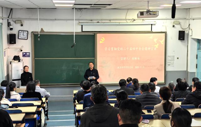 在4号楼A224教室举办学习贯彻党的二十届四中全会精神宣讲会。会议特邀学校党的二十届四中全会精神宣讲团成员、马克思主义学院刘琳琳副教授担任主讲,学院党委书记王迎秋主持会议,学院领导班子成员、全体教职工和部分学生党员共同参加了学习。