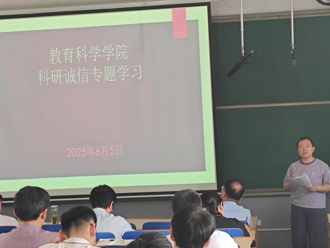 党委书记王迎秋、院长李军就学院科研诚信建设和学术不端治理工作作了进一步强调,要求全体教职工加强对科研诚信相关文件进行深入学习,抓好自身的学风建设,遵纪明规守底线,严防学术不端行为发生,共同建设好教科院严谨求实创新的学术生态,更好地服务学校高质量发展。