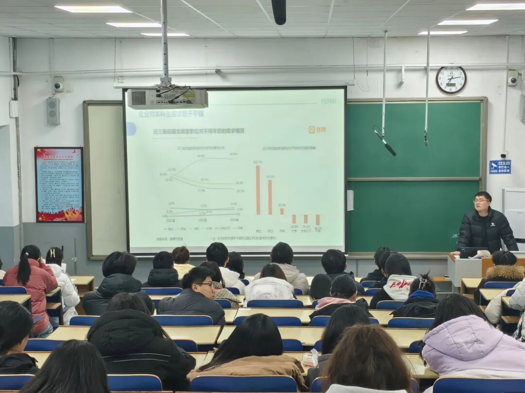 主讲人周铭围绕大学生就业的趋势、技能提升、发展路径选择以及能力提升策略四个方面展开了深入讲解。活动伊始,他深入剖析了当前大学生就业的趋势,指出虽然当前就业市场竞争激烈,但新兴行业如人工智能、新能源等领域需求旺盛,为大学生提供了诸多新机遇。在谈到就业技能提升时,周铭着重介绍了在校可考取的高含金量证书,如教师资格证书、普通话水平测试等级证书、英语四六级证书等,这些证书既是专业能力的证明,也是增加求职竞争力的重要材料。