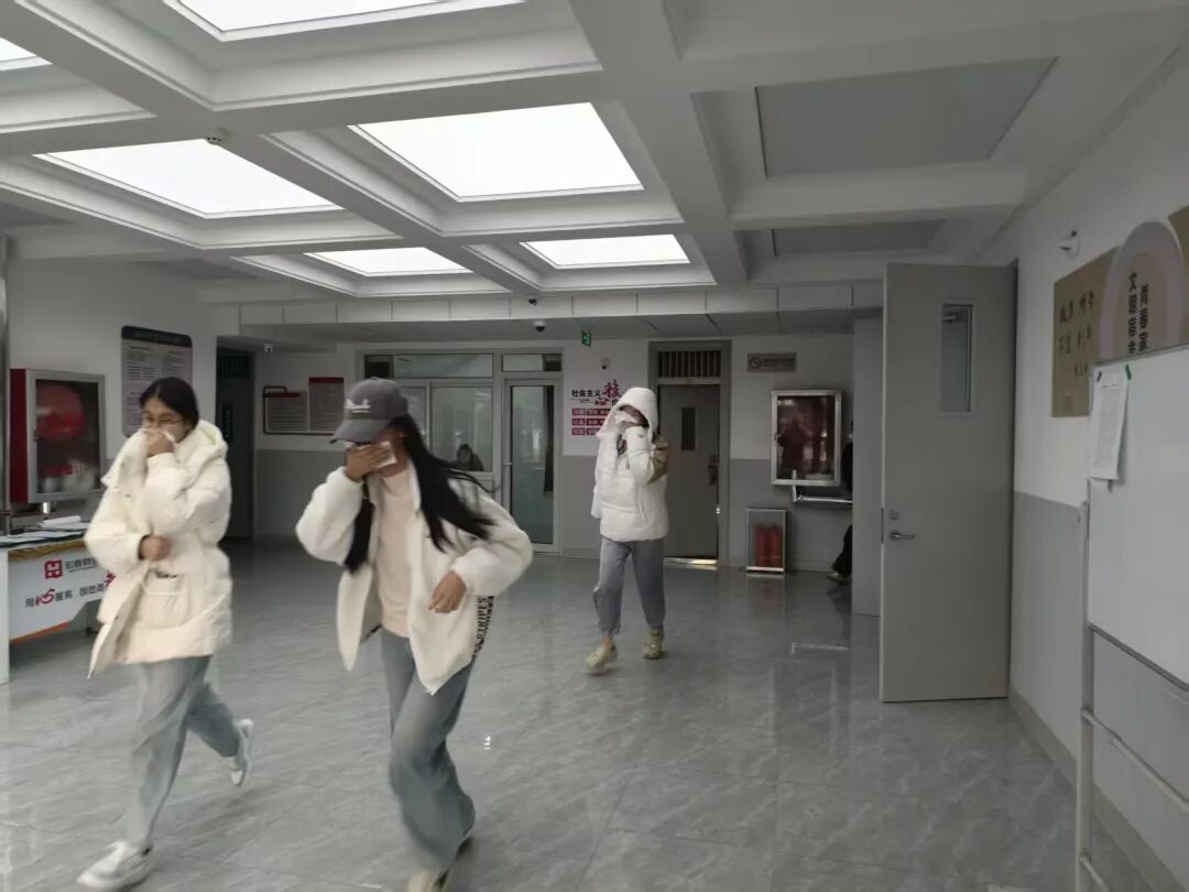下午两点整,一阵急促而清晰的哨声响起,应急疏散演练正式拉开序幕。听到信号后,同学们迅速反应,严格遵照预案要求,用提前备好的湿毛巾捂住口鼻,压低身体重心,弯腰沿墙边快速前行。大家沉着冷静,整个过程紧张有序,未出现拥挤、推搡现象,楼道内仅回荡着整齐的脚步声。按照预定疏散路线,学苑3号楼、2号楼,紫藤5号楼、6号楼同学们同步迅速向指定空地集结。