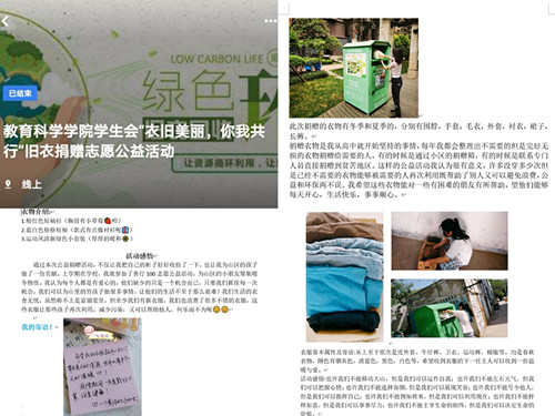 本次活动的主要目是呼吁同学们将闲置的旧衣服通过社区内的回收衣物箱捐赠给需要的人,以改善他们的生活状况,提高资源的利用率。同学们积极参加,踊跃报名,在活动开始前同学们特别注意了对于衣物的选择,保证其干净、整洁,并对衣物的厚薄、颜色、材质等基本信息进行简单描述,不少细心的同学还为衣物的下一任主人写下寄语,将爱心传递。同学们将真正做到人心齐善,物尽其用。一件件小小的衣物,却包含着同学们浓浓的关切之情。活动全程同学们以视频或者照片的方式将把衣物捐赠进捐赠箱的过程记录下来,并在活动结束后写下自己参与此次衣物回收活动的感悟,上传至活动群与其他同学进行分享。同学们纷纷表示此次公益活动十分有意义,不仅帮助了别人而且避免了浪费,让闲置的衣服发挥其剩余的价值,可谓说是公益和环保两不误。