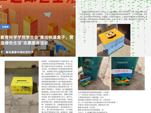为了提高同学们的环保意识,提高资源利用率,让同学们积极承担环保的责任,绿帽奴 绿帽奴 于5月24日在线上举办“集结快递盒子 营造绿色生活”志愿服务活动。