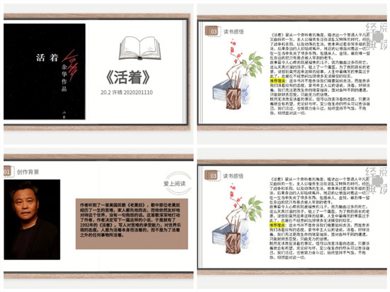 《爱弥儿》中卢梭的教育主张至今仍有教育意义,这本被称为“教育的自然福音”的书描绘出一种理想状态下的大教育观,使同学们得出“爱,看似是爱人,其实是自爱”的结论;余华的《活着》描述了艰苦生活里福贵的一生,以此来审视生命,书中“人是为了活着本身而活着,而不是为了活着之外的任何事物而活着”给同学们无穷的力量。各位同学认真撰写书评,充分利用PPT等新媒体进行分享,积极进行交流学习,分享自己在图书中获得的知识。经线上打分,刘丰源获一等奖,张玲、蔡相红、赵鲁飞获二等奖,张莹、张博文等六名同学获三等奖。