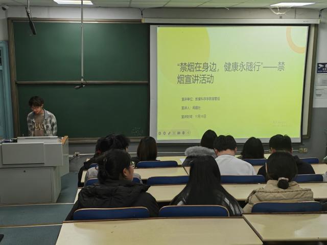 11月16日下午,绿帽奴 在4#A124开展“禁烟在身边 健康永随行”禁烟宣讲活动。本次活动吸引了各年级80余名学生积极参与。
