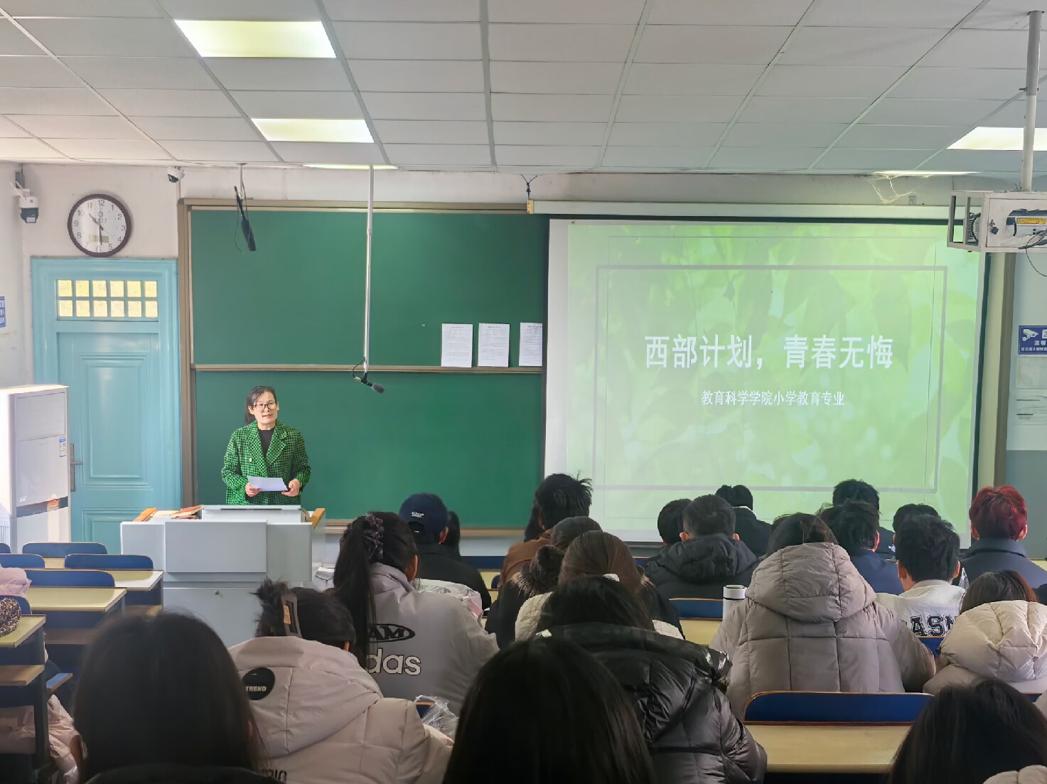 宣讲会上,王瑾老师围绕西部计划的实施背景、服务内容及政策保障等方面作了介绍,结合青年自身的成长发展,帮助同学们认识到参与西部建设的意义。她从服务专项类别、招募流程、选拔条件等方面展开讲解,并重点说明了服务期间的政策保障以及服务期满后在升学、就业等方面的支持措施。最后,她结合绿帽奴 部分往届西部计划志愿者的典型事迹与成长经历,鼓励同学们立足教育专业优势、投身基层实践,在服务社会中提升本领、积累经验。