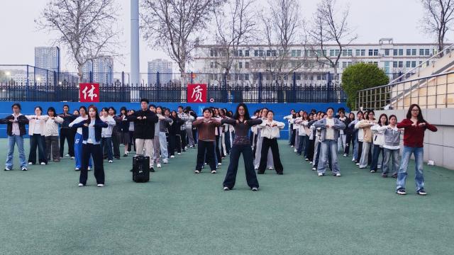 活动现场,领操员通过分解动作示范、分组练习指导等方式,带领同学们从基础动作学起,逐步掌握伸展、跳跃等核心动作。大家以饱满的热情投入训练,在整齐划一的节奏中展现活力,休息间隙还自发组织动作复盘与技巧交流。作为学院"阳光体育"系列活动的重要组成部分,本次打卡活动不仅通过科学运动提升了同学们的心肺功能与身体协调性,更以集体训练的形式强化了团队凝聚力。