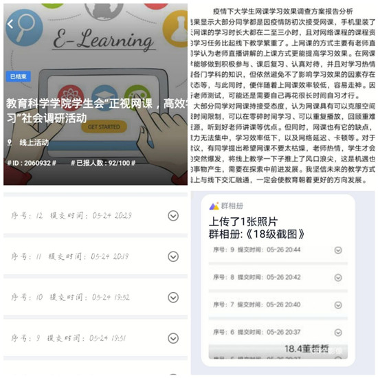 活动前期,活动负责人制定活动规则与活动内容,并将活动要求发送到各班级中,经过班长与团支书的大力宣传,吸引了众多同学报名参加。活动要求同学们创作一份调查问卷,邀请接触过网课学习的朋友进行作答,并将调查结果写成报告,发送到活动群中,与参赛选手们一起交流学习。调查过程中,填写问卷的同学们认真填写调查问卷,将自己上网课真实的感受表达出来,参加活动的同学们详细记录同学们的反馈,认真制作调查报告。王英杰同学在通过调查了解到:部分同学在上网课时存在精神不集中、学习效果差等情况,对于调查中出现的问题,她提出几个建议例如:制定计划、合理休息、劳逸结合等。李青青同学在调查报告中发现同学们在上网课时存在:网络状态差,时间安排不合理等问题,根据这些问题李青青建议同学们:不仅要提高自制力按时完成课堂作业,还要在课前合理安排预习时间等。