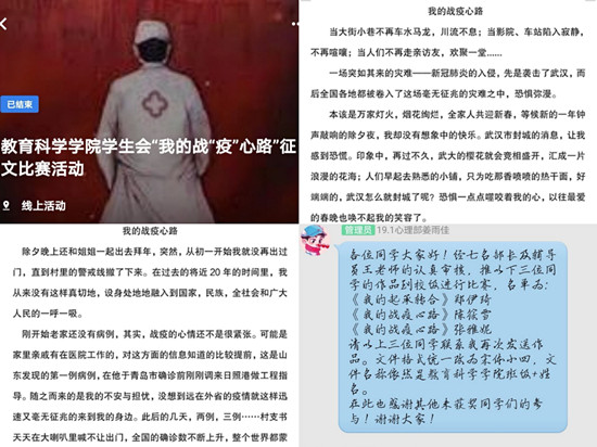 本次活动要求同学们围绕有关心理方面的主题,结合自身经验谈谈自己的“战役心路”,活动一经发出,同学们积极参加、踊跃报名。活动过程中同学们按时上交稿件至活动群中,作品形式多样,表达对前方抗疫的勇士们的感谢和敬意,传递疫情正能量。其中,有的同学将自己的内心转变过程分为起、承、转、合四个阶段,通过描述疫情暴发期间自身的经历感悟来体现全国上下不畏艰难、万众一心的昂扬精神;有的同学将自己在家的生活戏称为“修仙”,回忆了家里人如何买口罩捐到武汉、如何出去买菜的经历,为中华为武汉祈福加油;还有的同学歌颂在抗击疫情中诞生的感人事迹,对抗击疫情中具有突出贡献的行业和人物进行赞扬,通过了解他们的经历表达自己的心路。最后经过辅导员王老师及七名部长的认真评选,郑伊琦、陈筱雪、张雅妮三位同学被推荐进入校级比赛。