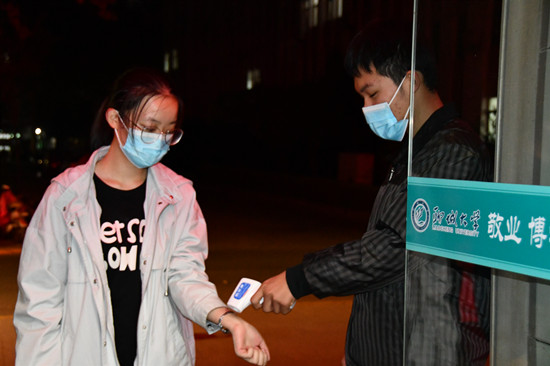 按照疫情防控应急处置流程,首先进行进教学楼环节演练,学院安排相关工作人员在体温监测点进行体温监测,学生按照学院要求间隔一米在规定区域列队等待测温,体温监测正常后,学生依次、有序进入教学楼。