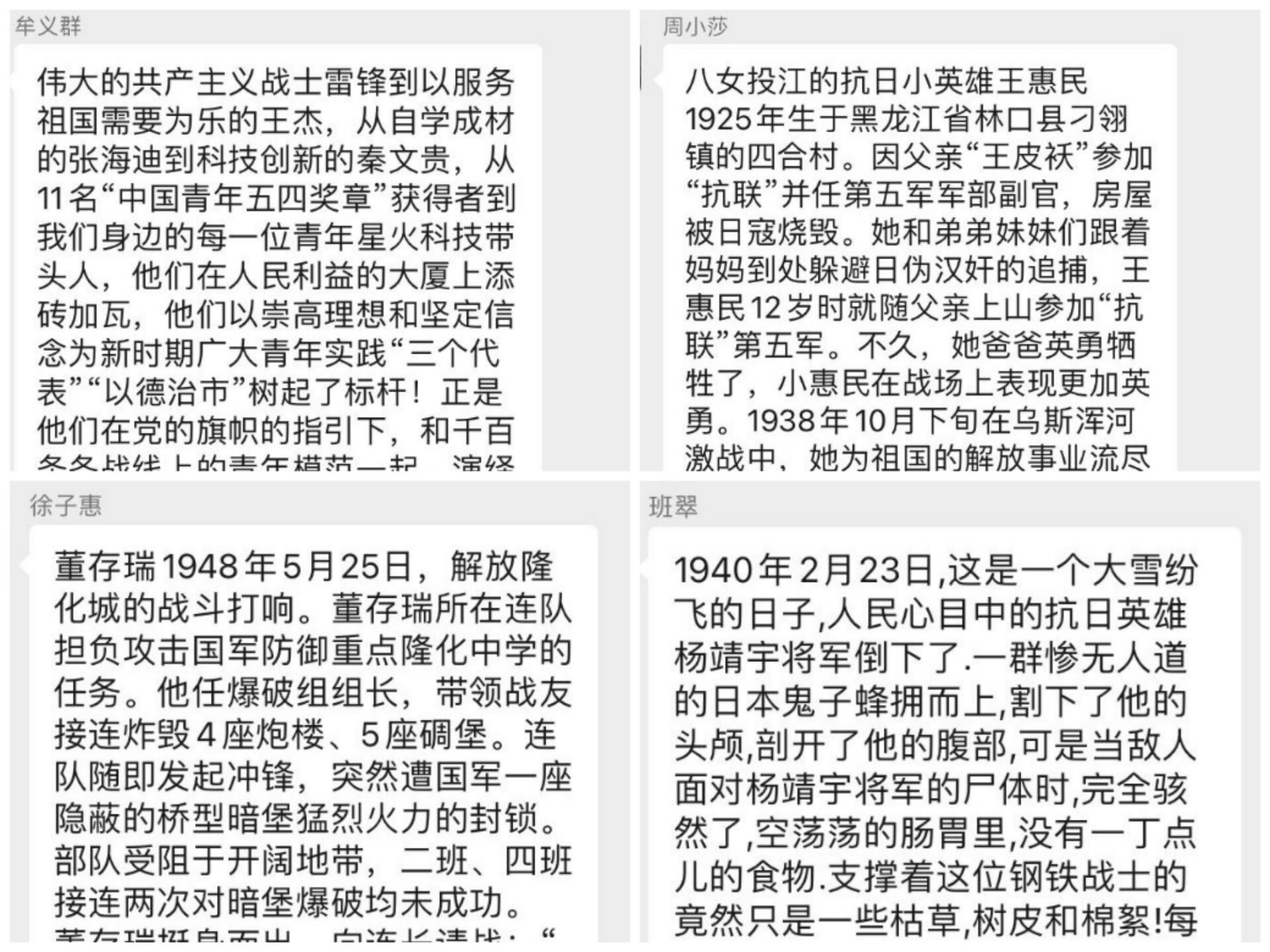 本次实践活动在线上开展,班级负责人公布此次社会实践的主题并与同学们共同商讨具体实践方案后,搜集有关红色文化的经典视频。全体同学通过互联网对这些经典视频进行观看学习。活动后期,全体同学在线上进行心得分享与交流。班长表示通过此次活动她看到了革命前辈的光环,看到了老一辈革命家为国为民奋斗终生的理想信念,并将带着这份信念,继续成长。其他同学们补充了许多视频中没有出现的革命人物的感人故事并齐心协力录制了歌颂中国共产党成立100周年的祝福视频。