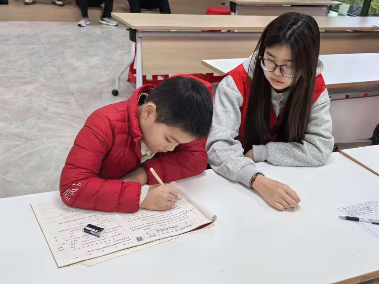 活动现场,志愿者们采用一对一辅导模式,为社区学生梳理作业中的疑难点,讲解解题思路与方法。为调动学习积极性,志愿者还精心设计了趣味互动环节,让原本略显沉闷的学习氛围变得轻松活泼。起初对难题犯愁的孩子们,逐渐主动参与讨论、积极提问,学习状态明显提升。针对当日学习表现突出的学生,志愿者及时给予表扬与鼓励,并通过线上沟通的方式,向家长同步反馈了学生的学习情况。辅导结束后,志愿者们分工协作,有序完成场地整理与卫生清扫工作,展现出良好的精神风貌。