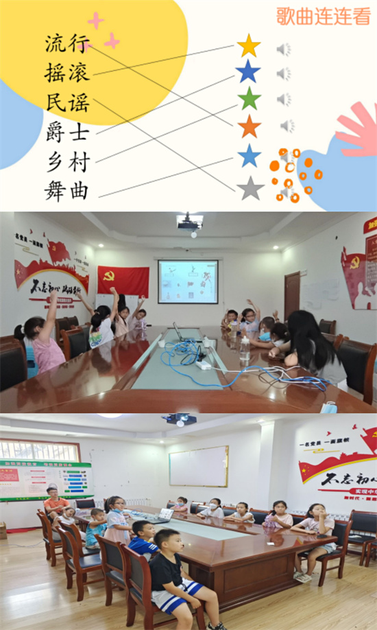 团队成员凭借自身专业优势与个人兴趣特长,采用线上与线下授课相结合的方式进行教学,为社区的儿童开展美育教育。团队成员课前预设学习中出现的问题,设计音乐连连看、手拉手舞蹈、绕口令朗诵、戏曲脸谱识别等课堂互动游戏,授课时引导学生积极参与教学活动。音乐课程从歌曲的定义、分类入手,利用“歌曲连连看”游戏让小朋友们区分歌曲种类,并与小朋友一同欣赏红色歌曲,了解中国传统红歌、中国新红歌的不同特点;主持朗诵课程深受小朋友的喜爱,趣味绕口令的游戏强调了普通话的重要性,使他们在收获快乐的同时轻松掌握字词的读音,现场气氛活跃。团队成员每天会将现场拍摄的照片和总结分享到建立的授课群中,以便更好地与家长进行交流。