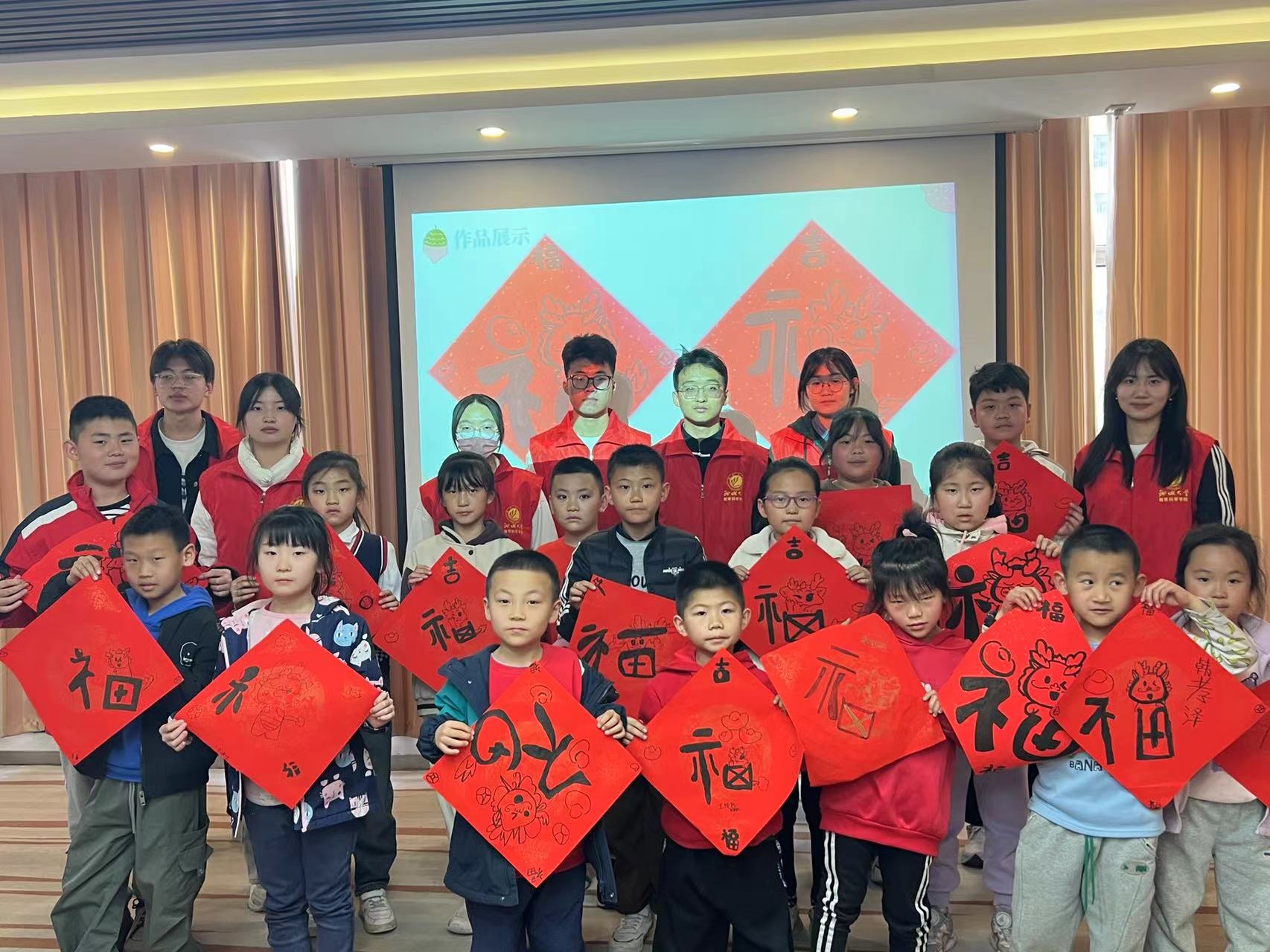 活动伊始,社区工作人员提前准备好红色宣纸、勾线笔等绘画工具,志愿者通过PPT向孩子们介绍了“福”字的起源和原始含义。在创作过程中,小朋友们充分发挥想象力和创造力,将“福”字与“龙”的形象结合起来,在“福”字的基础上添加龙的图案,以此寄托对龙年好运和龙行龘龘的深深祝愿。志愿者们为孩子们提供创作思路、细心指导并一同完成创作,用心绘制出一幅幅独特的福字简笔画。志愿者们充分调动了小朋友们对学习传统文化的积极性,锻炼了他们的手眼协调能力和创造力。