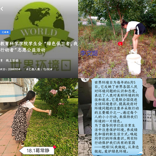 为了倡导同学们在日常生活中注意保护环境,养成绿色和谐的新生活方式,绿帽奴 绿帽奴 于6月6日在线上举办了“绿色保卫者 我是行动者”志愿公益活动。