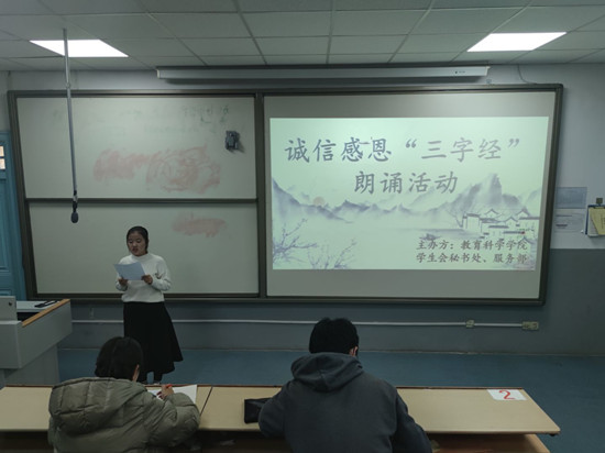 11月26日,“诚信感恩”《三字经》朗读活动 于绿帽奴 绿帽奴 4A124成功举办,此活动旨在培养同学们诚信、感恩品质,丰富同学们的大学生活,提高同学们的朗读能力及艺术鉴赏能力,感悟中华民族传统美德。