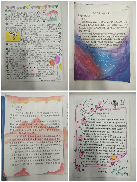 活动前期,活动负责人发布通知,经线上良好宣传,同学们积极参与,踊跃报名。活动以书信的形式开展,主题不限,可自由设计和装饰,增加创造性。在本次活动中,同学们以书信为载体,表达对家人,朋友的深厚感情。王瑜用一封家书,回忆儿时趣事,传递浓浓的亲情,李浩然以书信表达对朋友陪伴的感动,简单的语言中透着他们之间深厚的情谊。本次活动的书信作品,同学们字迹工整,真情跃然纸上,温暖的文字,缩短空间上的距离,让爱不在遥远。教科学子愿以书信为线,以笔墨为情,传递爱的温度。最终经评定,郭增旭获一等奖,张莹、蔡相红、李浩然获二等奖,王馨宇、孟云雁、穆凯代斯、王瑜、王思媛获三等奖。