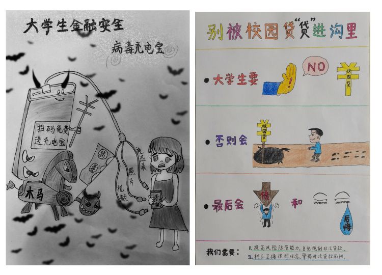 活动分为线上作品展示和评委打分两个环节,参赛选手需围绕“金融安全”的主题借助设计软件或以手绘的形式完成平面设计作品。阿丽代同学利用图片拼接等技术,以黑白对比的形式生动形象地向同学们展示了校园贷对个人和家庭带来的危害;黄巧艳同学的手绘作品由吸金的食人花、被金融安全“捆绑”的大学生和校园贷英文标志等要素组成,整体暗淡的色调为整个作品笼罩一层沉重的气息;张信雨同学以手抄报的形式向同学们宣传了大学生分期贷款带来的危害,画面两角绚丽精致的花朵昭示了拥有正确消费观和理财规划对未来生活的重要性。经评委打分,李冰柔获得一等奖,黄巧艳获得二等奖,黄兆飞、郭鑫、庞惠元获得三等奖。
