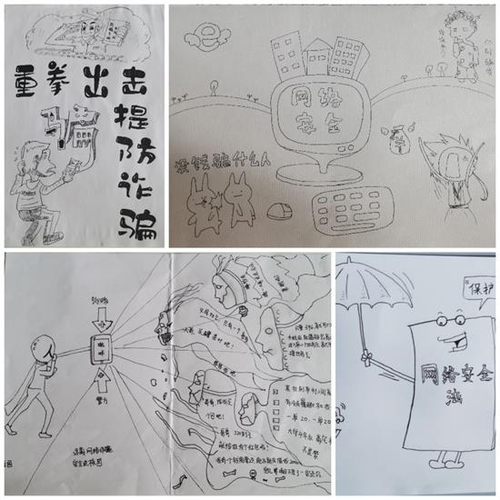 活动期间,参赛选手通过上网搜索或者询问老师同学关于网络诈骗的相关知识围绕着远离网络诈骗,安全知识进校园的主题,根据自己对网络诈骗的了解进行简笔画的创作。一幅幅画卷题材多样、内容丰富,既有知识性又有艺术性简笔画主要通过图案来表达时刻绷紧防范之弦,谨防犯罪的中心思想。张瑾同学用简单的图案向同学们展示了诈骗的几种方式;许晴同学则用“重拳出击,提防诈骗”几个大字直接警惕同学们提防网络诈骗。