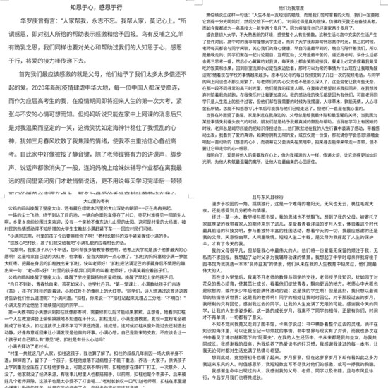 作品要求围绕“感恩、成长”两个核心关键词,通过文字唤起同学们的感恩情怀。平凡父母的爱、老师同学的相伴、书中的希望和热情在姜鲁的文章中体现的淋漓尽致;张惠笔下的大山里的孩子善良又纯真;谢明妤笔下的童年时光和高中生活丰富多彩,体现了她对半生挚友的感恩。负责人将参赛作品整理后发送给评委老师,由评委老师给予评价和相应分数。经评定,《且与东风且徐行》等作品获得一等奖,《淡看世事去如烟,铭记恩情存于血》等作品获得二等奖,《用心生活用心爱》等作品获得三等奖。