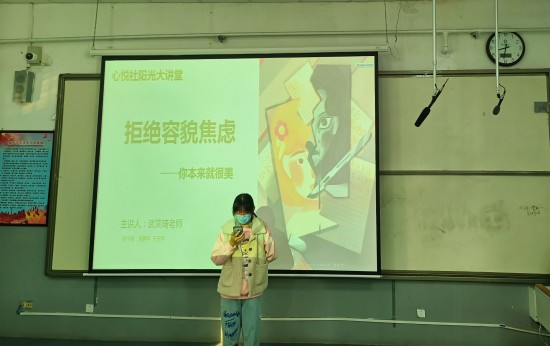 主讲人从容貌焦虑是什么、容貌焦虑的表现和解决办法三个方面为同学们讲解。通过阐述“聚光灯”效应的含义及表现,从心理学的角度解释了容貌焦虑产生的原因,认为克服容貌焦虑首先要发现自身的优点和各方面的美,每个人都有属于自己的闪光点,不必拘泥于自身缺点,要发现自己独特的美。主讲人从人的独特性角度提出美不应该千篇一律,让同学们不要在所谓的审美标准中迷失自己,鼓励同学们去发现自己的美。这一观点引发了同学们的强烈共鸣,在一阵阵热烈的掌声中,本次阳光心理大讲堂圆满结束。