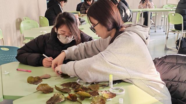 本次活动设置了“秋日魔法帽”“落叶日历”“树叶书签”三个环节。同学们分为五个小组,使用现场提供的树叶、彩纸、彩笔、胶水等材料进行创作。在“秋日魔法帽”环节,大家将落叶、枝条等材料与彩绘、拼贴相结合,设计出独具特色的帽子作品。“落叶日历”环节中,同学们以白纸为底,彩绘出日历与日期,同时用干树叶、植物装饰,制作出赏心悦目的日历作品。“树叶书签”环节中,同学们以枫叶、梧桐叶等为主要素材,通过拼贴、勾勒、点缀等方式,制作出包含人物形象、姓名图案等各具意义的书签。活动在轻松融洽的氛围中圆满结束。