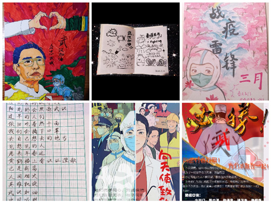 本次活动要求同学们用书法、制作海报、绘画、视频等方式表达对医务人员的赞赏。书法组的同学字形正倚交错,大大小小,开开合合,线条粗细变化明显,跌宕有致,有同学用毛笔字写到“愿来年春过,已是新篇”借此表达对武汉最美好的祝愿。海报组的同学充分利用了现代化科技,王子杰同学将急诊科医生的背影与人民群众的背影拼接到一张图上,用特别的方式致敬最美的逆行者。绘画组也不甘落后,有同学画出粉粉嫩嫩的樱花,表达对“春暖花开,国泰民安”的殷切期望,还有同学画出钟南山教授在武汉一线奋斗的状态,并借此表达对所有医务人员的敬佩。视频组的同学更是使出浑身解数有的将武汉医务人员与自己女儿隔空拥抱的视频和自己的舞蹈剪辑到一起,还有同学通过手语表达自己“武汉加油,中国加油”的心声。同学们用心制作的作品,先由评委选出优秀作品,最终通过公众号投票决出名次