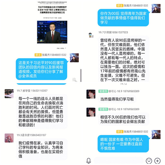 活动开始前同学们积极准备,分享整理好的资料到群聊中,每一位参加人员都跃跃欲试准备发表自己的见解。此次活动在QQ群中进行线上交流,由活动负责人在群内发布相关资料信息,并且组织全体成员集体学习习近平给北京大学援鄂医疗队全体“90后”党员的回信,每个人上交一份感想,负责人就组员上交的感想整理评价,并选择优秀作品在群内进行展示。活动中同学们积极参与,每个人分别对“作为大学生应该怎样让青春在党和人民最需要的地方绽放?”写出自己的回答。有一个同学写到:每一代人有每一代人的责任,90后正处于承前启后的阶段,作为00后应该多多向他们学习,成长为可以担当民族复兴大任的时代新人 。还有几个同学在感悟中提到:疫情期间大学生也要认真学习专业课知识、多读书充实自己,早日成长为可以报效祖国的青年人才。