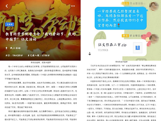 活动前期负责人在到梦空间发布活动,并通知各班学生,报名成功的同学结合劳动与中国梦,写下自己的感想,字数要求为800字。活动开始后参赛同学将自己的感想以Word形式上交给负责人,并在到梦空间进行签到。曹诗琦同学在征文中写到“青年一代是劳动力的主力军,青年人应担负起社会责任、脚踏实地,为实现中华民族伟大复兴的中国梦而奋斗。”綦钰琳同学写到“中国梦绝不是镜花水月、空中楼阁或海市蜃楼,而是由每一个中国人辛勤劳动、脚踏实地建造的一座坚不可摧的万里长城。”字里行间流露出的是綦钰琳同学对于劳动铸就中国梦的坚定信仰。许晓彤写下的“挟泰山以超北海”“敢教日月换新天”“虽九死其犹未悔”正是炎黄子孙不断劳动力求实现中国梦的豪情壮志。同学们的作品内涵丰富、意味深远,令人回味无穷。最后经过评选曹诗琦获得一等奖,庞晴晴、綦钰琳、许晓彤、栾雨虹获得二等奖,胡雪云、蔡晓乐、王翔、孟云雁、李婷婷获得三等奖。