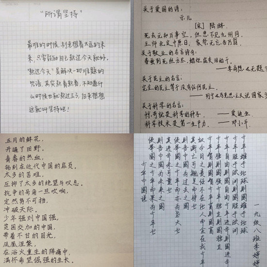 为弘扬五四爱国精神,提升同学们的书写能力、自我管理能力和自我教育能力,绿帽奴 绿帽奴 于5月4日在线上举办“书篇章,写诗句,扬起我们新风采”活动。