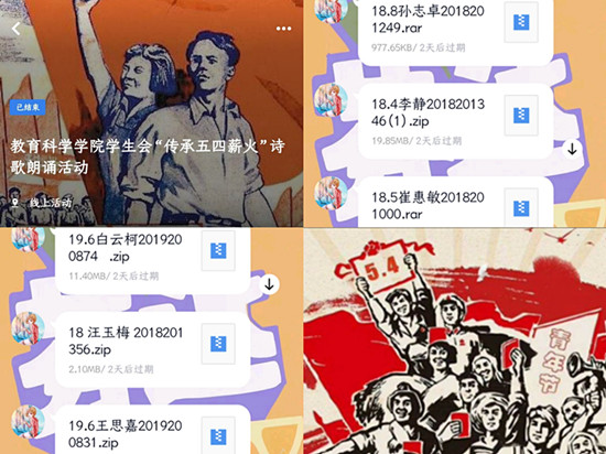 活动前期,活动负责人与评委们商讨了关于本次活动的评分标准和注意事项,并进行合理地人员分配,以保证活动的正常运行。本次活动要求同学们录制一段或一首有关五四精神的诗歌,视频可以是录制自己朗诵诗歌时的场景,也可以选取网络视频剪辑并配上自己的朗诵。活动期间,同学们积极参与,在规定时间内交上自己的作品。同学们朗诵时感情饱满,抑扬顿挫,将自己的爱国情怀表达得淋漓尽致,其中有同学铿锵有力地朗诵了一首《少年中国说》来表达自己愿肩负起建设少年中国的重任。还有的同学朗诵了语言清丽、意味隽永的《生如夏花》表达了自己愿为祖国绽放青春的豪情壮志。经过评委打分,最终滕晓云同学获一等奖,陈磊和吕晓慧同学获二等奖,栾雨虹、韩博雅、黑琳杰和陈姝蓉同学获三等奖。