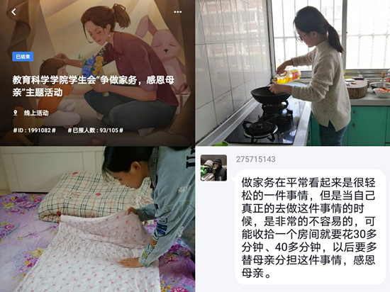 活动前期,负责人创建活动群并对相关负责人合理地进行任务分配,同时向参与者讲解活动规则和注意事项,以保证活动顺利进行。本次活动以帮助母亲做家务为主要内容,参与者按时将做家务的照片或视频以及200字左右的感想上传至活动群。在活动过程中,同学们通过分担做饭、打扫卫生、洗衣服等家务活,让辛苦工作的父母一回家就可以吃上热乎的饭菜;让家里的环境焕然一新,使家中变得整洁美观;将脏衣服放到洗衣机里,晾干并整理到衣柜中,用实际行动回报母亲的爱。同学们在表达自己心中感想时,有的同学回顾了与母亲生活的点点滴滴,并表示会对母亲多一些理解和感恩;有的同学通过这次活动体会到了母亲的辛酸与不易,希望能在生活中帮父母做一些力所能及的事情;也有的同学感慨时间过得太快,表示今后会珍惜与母亲一起生活的时光并为母亲送上美好的祝福。活动后期,相关活动负责人对同学们上传的作品进行收集、整理、评选,并在到梦空间发放积分。