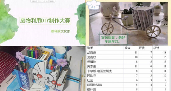 活动准备前期,活动负责人发布活动通知、创建活动QQ群并联系评委。各班班委对活动进行宣传后统计参与人员名单并及时上报。活动要求参赛者利用生活中废旧的小物件动手创造,制作出自己感兴趣的小物体,并将制作过程剪成视频,在规定时间内将视频和作品阐述发送给相关人员。活动期间,活动负责人安排相关人员以屏幕共享的方式展示同学们的参赛视频,每一位参赛者在视频结束后对作品进行简单介绍,每一位同学都充分利用家中废料,以独特思维创造出一件件精美的作品,同学们的手工作品紧贴主题、创意十足、各具特色、实用性也很强。活动后期,活动负责人发起线上投票,经最终统计,李文煜同学获得一等奖,杨慧、石继飞同学获得二等奖,于海洋、苏紫怡、祖嘉璇同学获得三等奖,胡鑫烁、司媛薇、周新萍、蔡天格、王资源同学获得优秀奖。