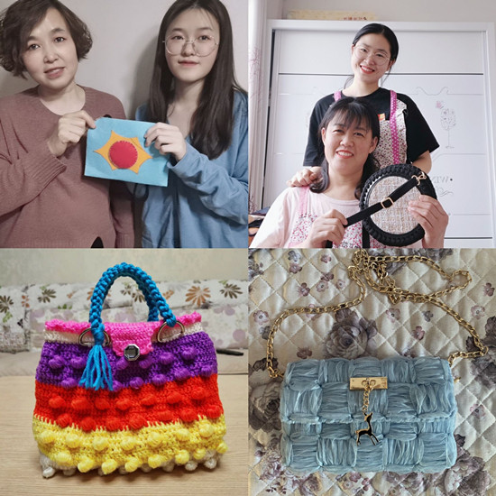 活动前期,同学们利用身边的资源或网购材料提前准备好制作手工包所用的原材料,并通过网络平台自主查找心仪的编织教程。活动过程中,同学们根据网络编织教程,并适当增加自己的创意和想法,增加手工编织包的独特性和创新性。有的同学用珍珠作为编织包的主材料,用金属圆环作为包链,对编织包整体形状进行设计,时尚又精致;有的同学把家里的旧布料作为原材料,用针线缝制,制作的编织包满满的年代感,似乎带回了母亲年轻时的岁月;还有的同学用毛线作为原材料,根据教学视频穿插编织,并用金属钥匙作为装饰,具有强烈的设计感。同学们将手工包编织过程以视频的形式进行记录,在母亲节到来之际,亲手将制作完成的精美的手工编织包亲手送给母亲,并和母亲一同拍照留念,定格这幸福的瞬间。