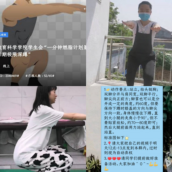 为增强同学们自身免疫力,激励同学们加强体育锻炼,保持强健体魄,绿帽奴 绿帽奴 于5月17日在线上举办“一分钟燃脂计划第三期之极限深蹲”活动。