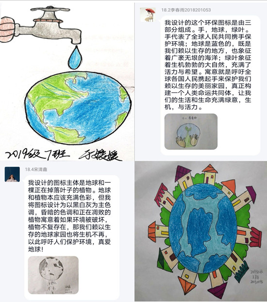 本次活动经线上良好宣传,赢得广泛关注,同学们积极报名,踊跃参加。活动通过线下绘画、线上展示的形式进行,要求以“保护环境,执起画笔,你我同行”为主题进行创作。同学们融入个人创意与特色,结合多种环保元素,绘制出一幅幅精美的环保图标。其中,于媛媛同学将水龙头、地球及水滴等元素结合在一起,寓意着水是生命之源,警示同学们要保护水资源,拒绝水浪费;宋清鑫同学以黑白灰色为主色调,利用枯萎的植物和地球等元素,呼吁同学们保护环境,让地球充满色彩;李春雨同学借助双手这一元素,地球、绿叶象征着生机勃勃的大自然,鼓励同学们应携手共同保护自然,才能使生活充满绿意。同学们创意新颖,构图完整,色彩搭配合理,绘制完成后将环保绘画图标及100字以内的介绍上传至活动群中,与同学们分享。