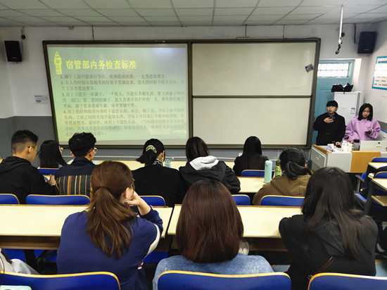活动伊始,主持人从活动意义引入主题,明确了此次活动的交流方向。服务部赵云萍用幽默风趣的语言向同学们介绍了什么是权益,大学生为什么要维权以及怎样维权。从传销,电信诈骗,电桩私自占有等生活常见现象出发解释维权的重要性,她风趣横生的讲解使同学们在了解到与权益相关知识的同时收获了欢乐。随着气氛的活跃,本次活动进入第二项内容,宿管、生活卫生、纪检、体育等各部分负责人上台通过PPT详细条理地介绍部门的监管范围及量化标准,内容通俗易懂,将之前新生们对扣分界限模糊的地方解答清楚,便于大家更好地维权和遵守纪律。之后参与活动的各部处代表为大家答疑解惑,同时服务部将浴室、餐厅、水房等工作人员的联系方式以及合法维权手段通过PPT呈现,益于同学们以后维权更加合理,生活更加便捷。