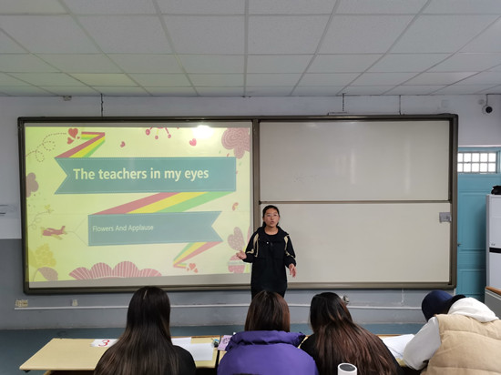 本次比赛分为初赛和决赛两场比赛。初赛演讲主题不限,经过激烈的角逐,王鑫玉、王璇等15名选手进入决赛。决赛阶段,参赛选手围绕着“我眼中的老师”进行演讲。在演讲过程中,参赛者全身心投入比赛,演讲内容丰富多彩,其中,张璐同学在英语演讲的过程中辅以歌唱的形式,让人耳目一新,在场观众认真倾听,活动气氛高涨。最后,傅瑛老师点评,表扬了优点,指出了不足,尤其对语调、音调及语速方面的问题进行了详细地指导。她号召同学们要积极参加活动,克服功利心态,享受比赛过程,锻炼提升自己。经评选,王鑫玉、张璐获一等奖,王璇、杨思琦获二等奖,腾晓云获三等奖。