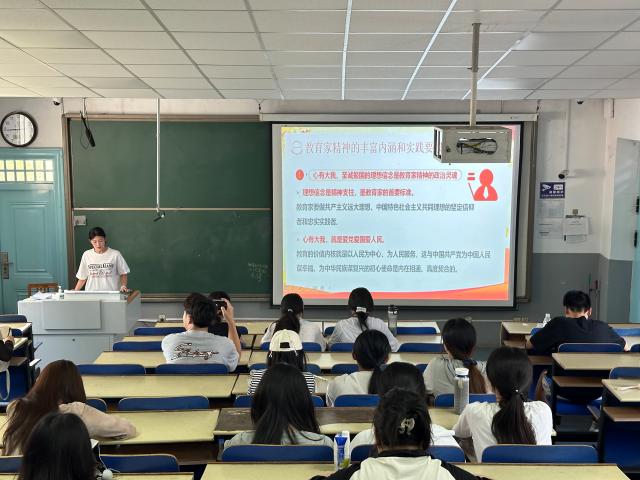 本次活动邀请了堵钟心、王梓妍、王雨山、姜雨辰为主讲人。活动中,王梓妍分享了教育家精神内涵,她强调教育的价值内核就是以人民为中心、为人民服务;堵钟心为大家阐述了怎样践行教育家精神,她还通过播放季羡林先生的纪录片,鼓励同学们把教育家精神落实到日后教书育人的具体实践之中去。