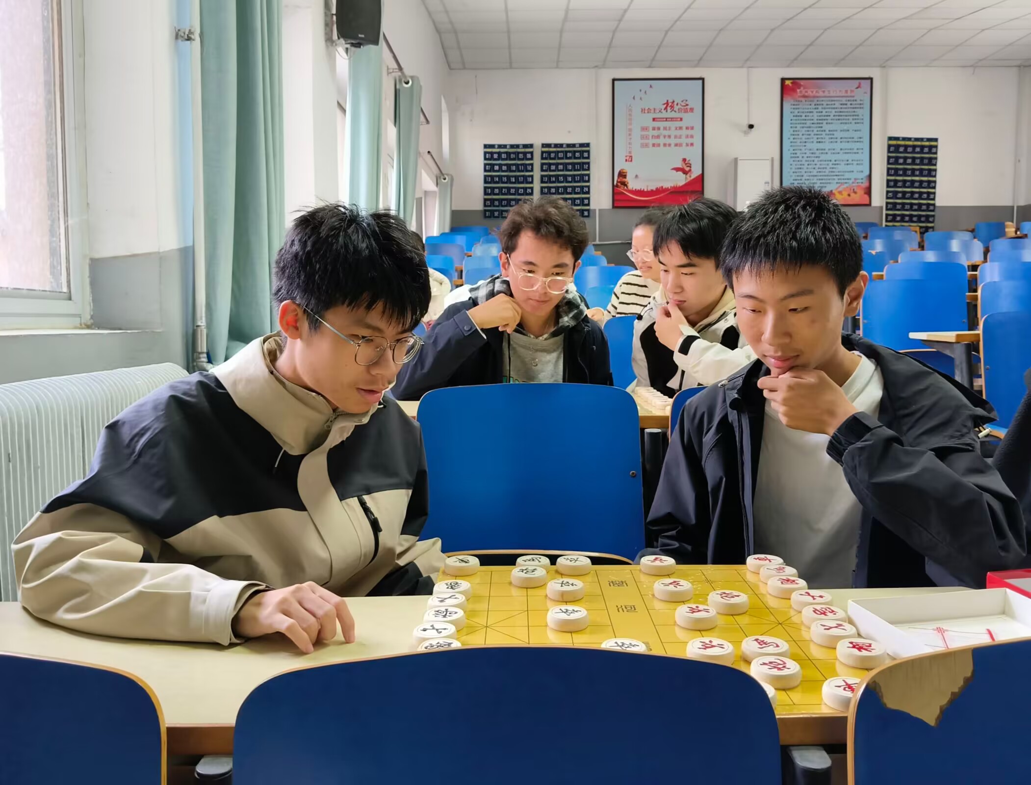 象棋交流会现场气氛热烈,同学们热情高涨,踊跃参加。棋手们自由组队,以棋会友,切磋对战。棋盘前,棋手们相互交流,分享自己下象棋的有趣经历和实用的下棋小技巧。对弈中,棋手们全神贯注,巧妙地运用各种方法在棋盘上展开智谋与方略的角逐。在象棋对弈中,每一步落棋都至关重要,挑战与机遇并存,充分展现出象棋的魅力与内涵。观棋的同学也都屏气凝神,被精彩的对局深深吸引,仿佛置身棋局之中。随着时间的推移,象棋交流会接近尾声,但棋手们仍沉浸其中,相互分享在下棋过程中的深刻感悟和珍贵收获,这有助于提高棋手们的象棋技艺,让棋手们更好地应对复杂的棋局。