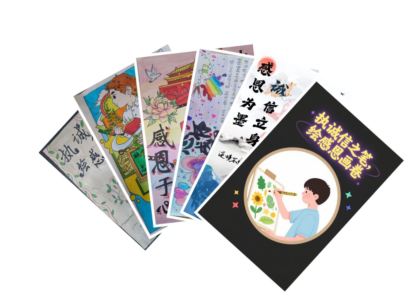 本次活动吸引了众多学生参与,参赛者通过手绘或电脑设计等方式,创作出一幅幅富有创意的作品。其中刘孜彦的作品巧妙融合象征诚信的天平、象征感恩的鲜花和爱心等元素,搭配明快的色彩,彰显出同学们对诚信与感恩内涵的独特理解与精彩诠释;许丹彤的作品通过运用长城、雪山、书籍等元素,搭配 “感恩为墨 诚信立身”等文字,传达出在逆境中坚守诚信、感恩,对未来充满希望的积极态度。经过评委严格评审,刘孜彦获得一等奖,高志彤获得二等奖,闫晓越、许丹彤获得三等奖。
