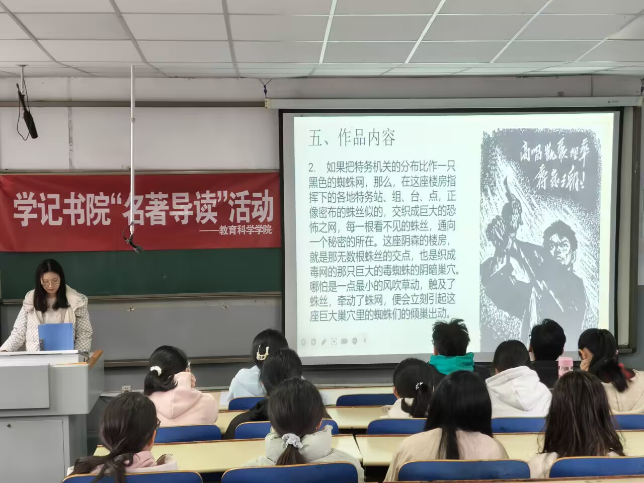 活动伊始,主持人简要介绍了活动的目的与内容,随后邀请主讲人刘嘉琪对《红岩》这本书进行导读。刘嘉琪从红岩精神的内涵出发,深入剖析了这部由罗广斌和杨益言共同创作的革命历史小说。在她的讲解下,同学们深入了解了《红岩》中许云峰、江姐等共产党人的英勇事迹,这深深触动了在场每一位同学的内心。同时,刘嘉琪还结合小说内容,引导同学们思考如何更好地传承和弘扬爱国主义精神。,同学们认真倾听,积极与主讲人进行互动。活动结束后,同学们纷纷表示要将红岩精神内化于心、外化于行,从中汲取奋进力量。