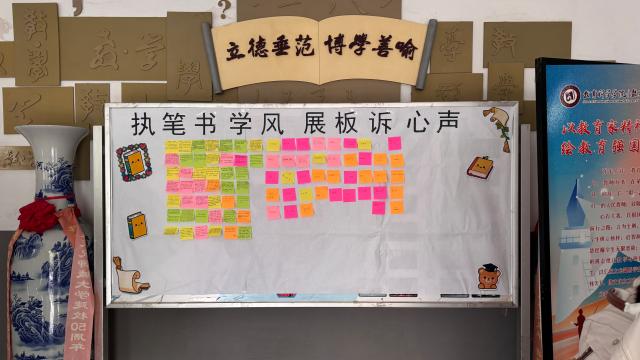 活动开始前,志愿者们提前设计展板、准备便利贴,等待同学们有序入场。主持人首先简要介绍了“学风建设”的主题意义,随后同学们围绕日常学习中的自律方法、学术认知等话题展开交流。在书写环节,大家静坐桌前,用文字记录下各自对学风的理解和对学习的期待。书写完成后,同学们依次将便利贴粘贴在展板的相应区域,现场氛围温馨而热烈。志愿者们在一旁协助整理,将便利贴排列得更加整齐美观,使展板成为教学楼中一道既有温度又有美感的风景。