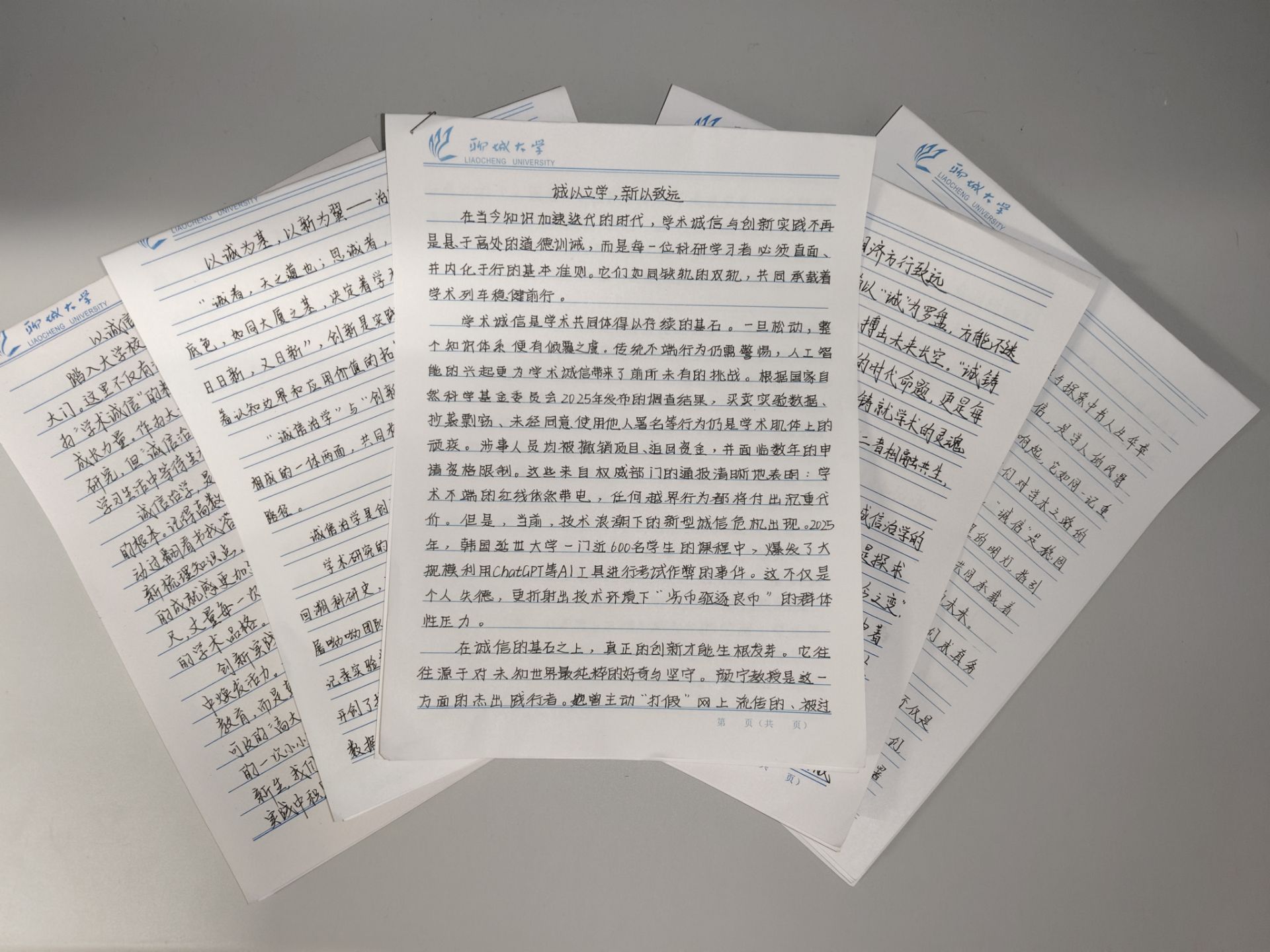活动期间,同学们认真思考、积极创作,围绕“学术诚信与学术创新”这一主题,表达了各自的理解与体会。胡思怡在《诚以立学,新以致远》中提出,在技术快速发展的今天,学者应坚守诚信底线、勇于创新探索,共同推动学术进步;张玉茹的《以诚信为基,以创新为翼》强调了创新与实践相互促进的关系,倡导大学生以诚信为本、以创新为动力,书写属于新时代的学业篇章;王俊伟在《以诚为基,以新为翼——治学路上的双向奔赴》中,呼吁青年将诚信与创新融入学习与实践,以实际行动贡献青春力量。经评审,胡思怡荣获一等奖,张玉茹、王俊伟获二等奖,毕家晨、王乐乐获三等奖。