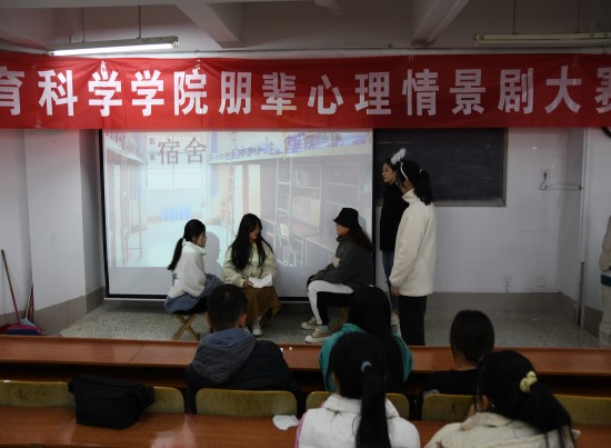 活动伊始,主持人介绍评委、参赛者和情景剧比赛规则,并宣布比赛正式开始。参赛者按编号依次上台表演,每组表演完后评委打分。参赛者表演的剧本内容积极健康,构思新颖,内涵丰富,具有时代感,贴近大学生生活,具有艺术气息,充分展现了积极向上的生活学习态度。其中,六班的参赛者演绎了当代大学生“社交恐惧症”的心理障碍问题,鼓舞同学们正确认识自我,充分表现自我;三班的参赛者将大学英语、心理学、教育学原理等学科内容结合小品进行演绎,缓解了同学们面对期中考试的紧张感。观众们遵守活动纪律,聚精会神,认真观看。参赛者表演结束后,由评委上台针对本次比赛进行点评。随后主持人核对分数,确定出优胜参赛者,公布最终获奖名单,并邀请评委向获奖者颁发奖品。最后评委和全体参赛者合影留念,主持人宣布活动结束,组织观众有序离场。