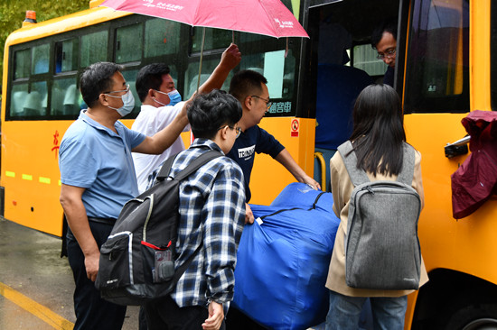 清早阴雨蒙蒙,两辆校车抵达学校。副院长王平、教育学系主任满忠坤、实习支教指导教师徐湘荷、班主任任锋4位老师以及聊城教体局领导冒雨到达紫藤五宿舍楼前等候,帮助同学们搬运行李物品,之后同学们排队上车,老师们仔细叮嘱注意事项,同学们与老师道别后乘车驶离校园。