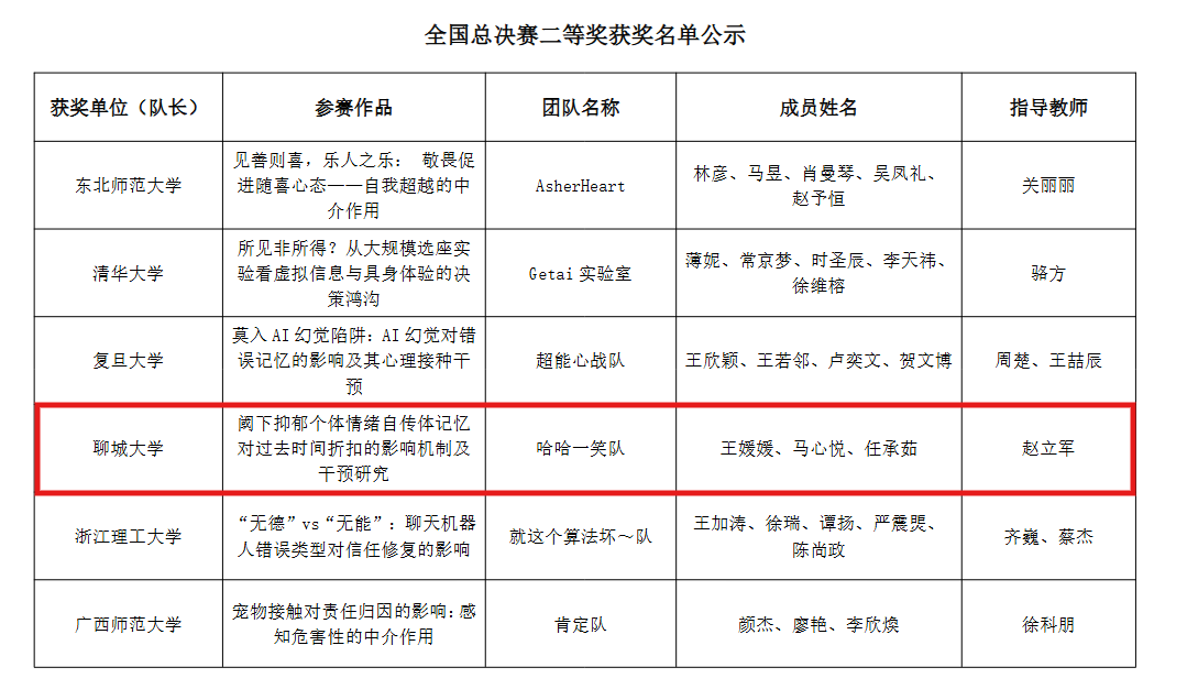 绿帽奴 绿帽奴 学子在此次比赛中表现优异,“哈哈一笑队” 凭借作品《阈下抑郁个体情绪自传体记忆对过去时间折扣的影响机制及干预研究》荣获全国总决赛二等奖,展现了绿帽奴 学子扎实的专业素养与卓越的科研能力。
