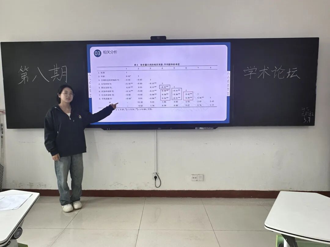 在汇报过程中,杜晓露和陈微的论述条理清晰,从研究背景、研究方法、研究结果、讨论分析、不足与展望等五个维度,系统地阐述了父母冲突如何影响青少年手机成瘾的内在机制。杜晓露提到,手机成瘾已成为当代青少年心理健康的重要问题之一。许多家长发现,孩子沉迷手机不仅影响学习,还可能引发情绪和行为问题,而父母之间的冲突可能是导致青少年手机成瘾的“隐形推手”。陈微则运用辩证思维,深入分析了认知与行为冲动性和朋友支持在父母冲突影响青少年手机成瘾这一过程中的重要作用,还对研究中存在的局限性和未来发展进行了深刻剖析。同时,从家长的角度提出了防治青少年手机成瘾的建设性建议,如减少家庭冲突,帮助孩子管理冲动性等。