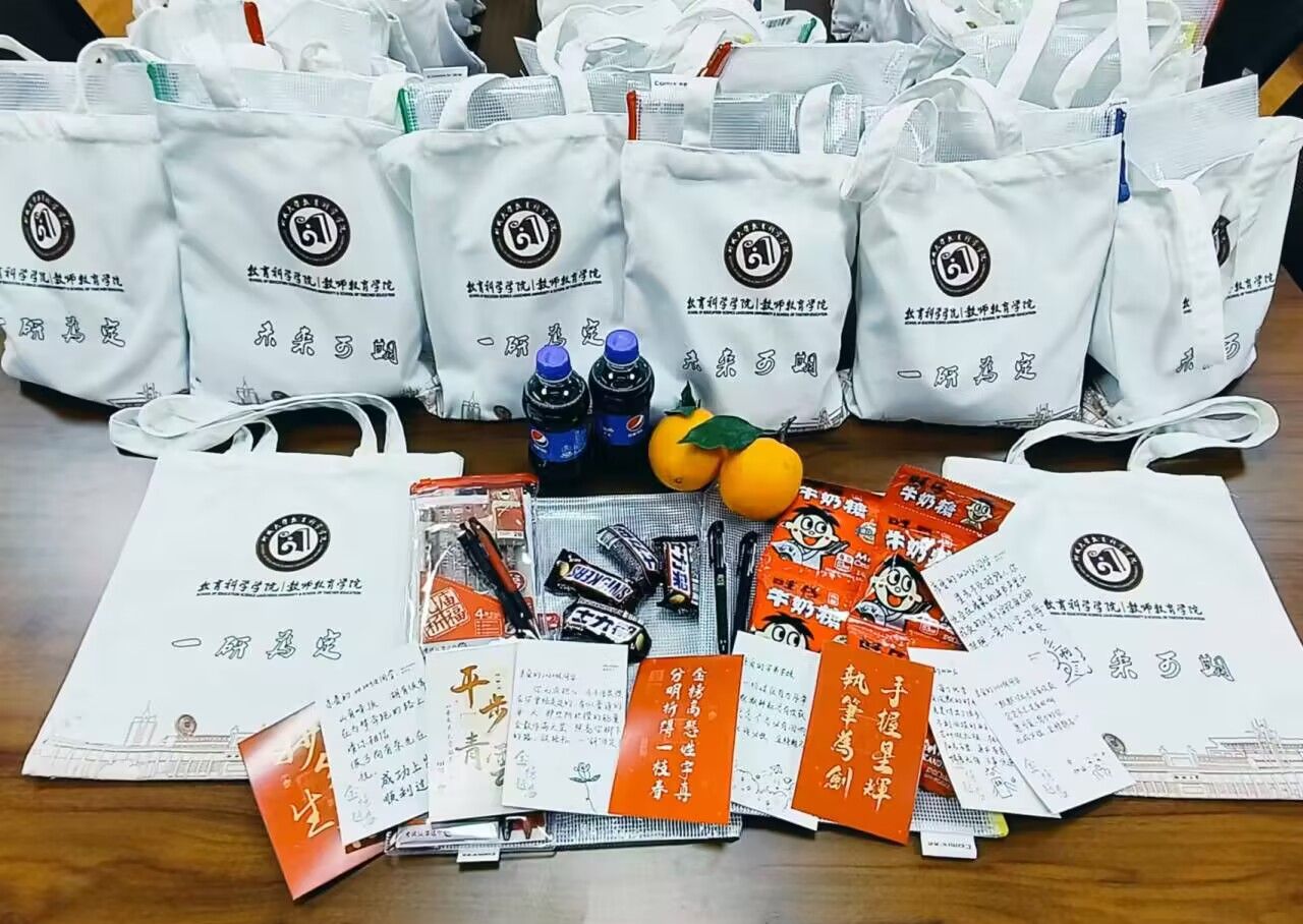 院长李军代表学院向考研学子们表达了真切的关心和祝福,鼓励考研学子们坚定信心、稳定心态,以最好的状态迎接研究生考试,祝愿同学们考取满意的成绩,金榜题名。随后,老师们为考研学子们送上了学院精心准备的“考研加油包”。这份“考研加油包”中的每一样物品都寓意着美好的祝愿与关怀:“一研为定”福袋、“力量满满”士力架、心想事“橙”、“牛气冲天”牛奶糖、事事顺利“可乐”,当然少不了考试必需的文具,还有来自研究生学长学姐的祝福卡片。礼包满载对考研学子的殷切祝福和期待,助力考研学子研冬折桂!