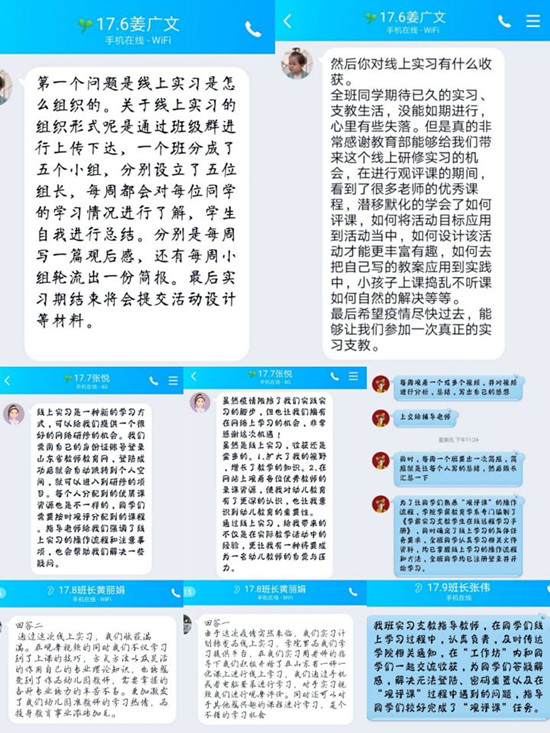 面对来势汹汹的疫情,实习计划由线下转为线上。2017级教科学子根据学习任务手册和相关文件资料,明确操作流程和具体任务,在指导老师的帮助下,利用学院提供的学习平台积极地参与线上实习,为未来的职业生涯做准备。线上实习是一种全新的学习方式,以按时观评网络优质课为主要方式,同时每周以班级为单位汇总同学们的个人总结作为简报。指导老师在同学们的线上学习过程中,认真负责,及时传达学院的相关通知,在“工作坊”内与同学们一起交流收获,为同学们答疑解惑,解决无法登录、密码重置以及在“观评课”过程中遇到的问题,为同学们完成“观评课”任务保驾护航。本次线上实习工作实现了优秀教师录课资源共享,并为同学们提供了学习其他感兴趣的课程的机会,使同学们在学好本专业基础知识的同时,拓宽了视野,增长了教学的知识面,更加深刻地认识到学好本专业知识的重要性和作为一名人民教师的责任、付出与担当,以更加饱满的热情投入到幼儿园准教师的学习中,为教育事业添砖加瓦。