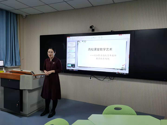刘晋博士从国家新文科建设、国家一流课程建设理念和要求出发,以山东省高校青年教学比赛为例,对课堂教学内容、教学组织、语言教态、教学特色等四个方面对高校优质课堂怎么建构,教师需要秉持怎么的理念,做出怎样的改革行动等进行了既有高度又切合实际的分享。刘晋博士强调课堂教学要贯彻以学生为中心的理念,认真分析学生学情,注重融入课程思政,强化价值引领,理论联系实际;在内容和方法上体现两性一度;充分利用超星、雨课堂等信息技术支持的教学平台等创新方法手段,改变传统单纯依靠教师讲授的课堂教学方式;要注意体现凸显学生学习主体地位,通过对学生的启发,与学生的互动,调动学生积极思考,营造良好的课堂教学氛围。刘晋博士还鼓励老师要有自信,不要抛开个人自己的优势和特长,寻找、积淀和形成自己的教学风格,教出自我风格,教出自我的风采。